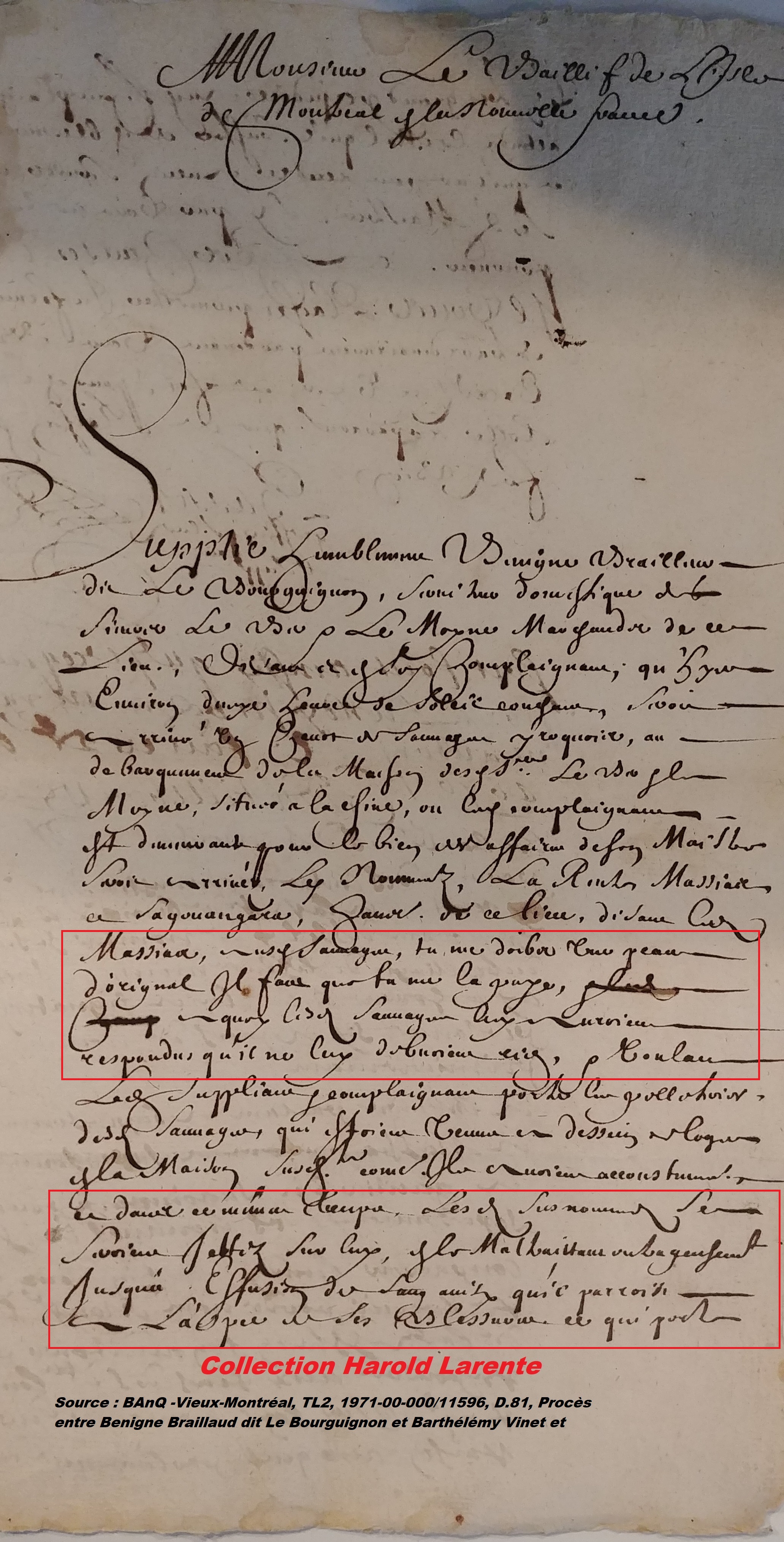 Bénigne Braillaud dit Le Bourguignon, serviteur et domestique de Jacques Le Ber et Charles Le Moyne, marchands de Lachine, porte plainte contre Barthélémy Vinet dit Larente[1], Mathias Chatouteau dit Massias[2] et Pierre Gauthier dit Sagouingarra[3] pour une « batterie »[4] survenue alors qu’un canot de sauvages[5] amenait des pelleteries à Lachine.