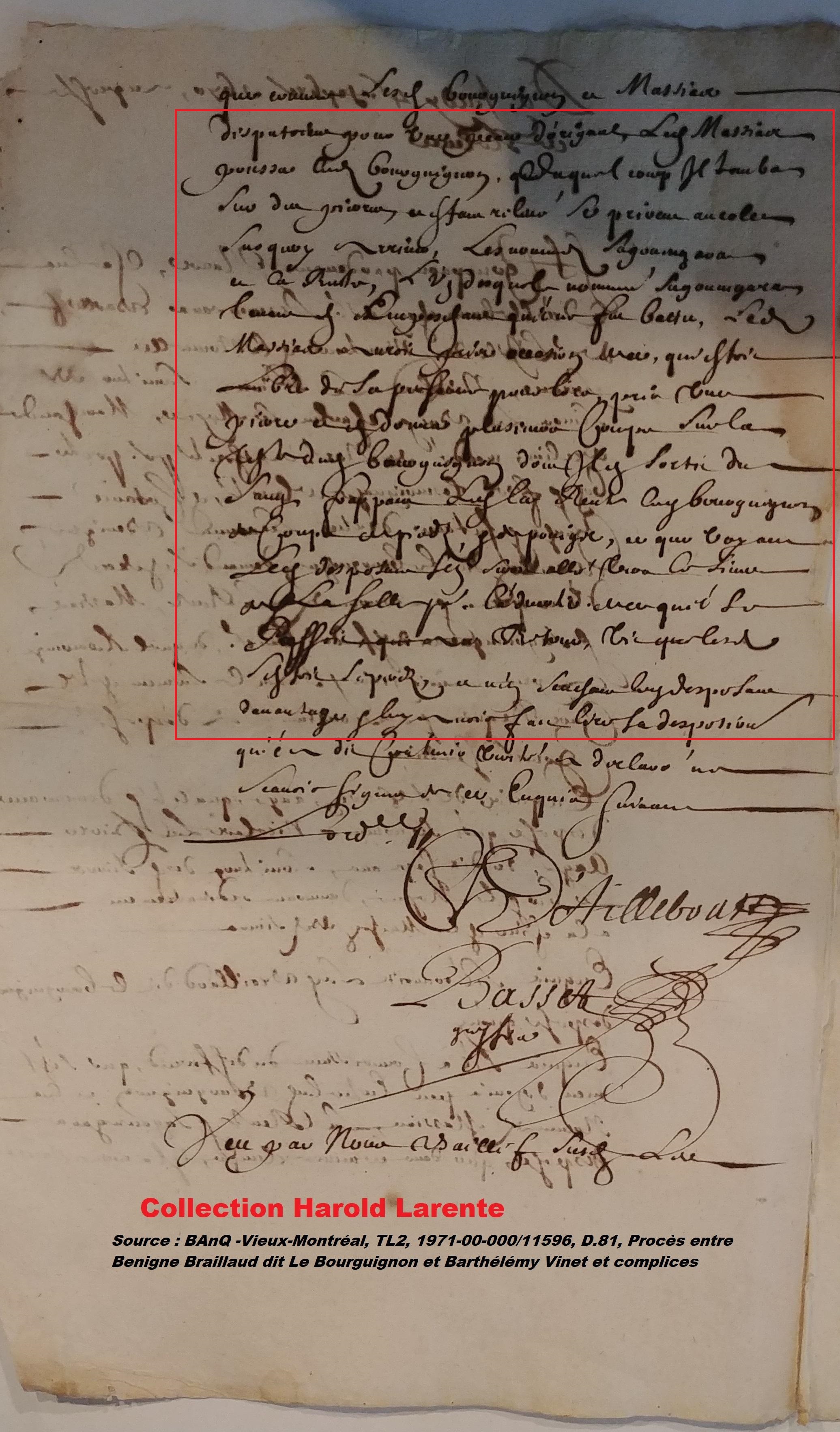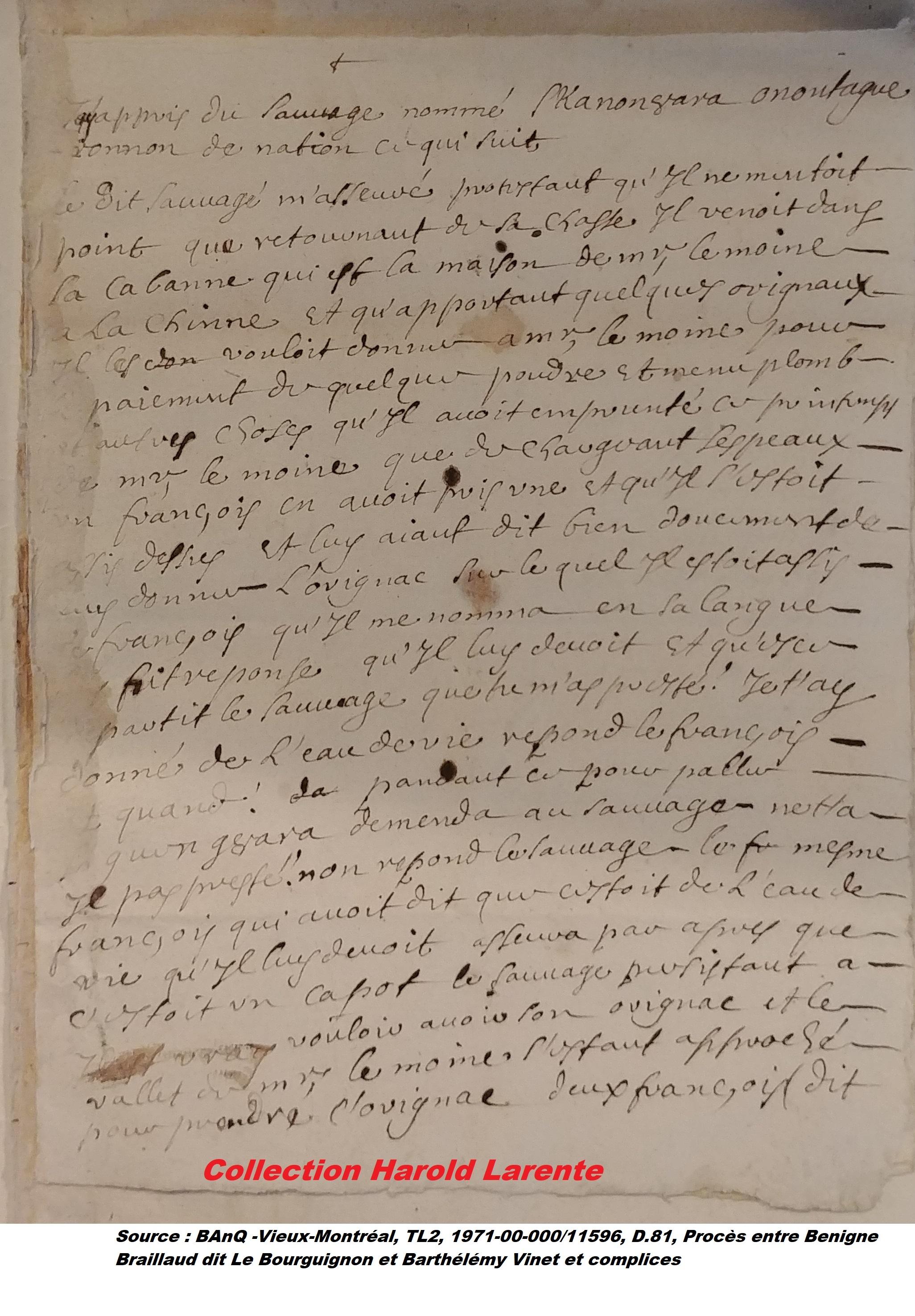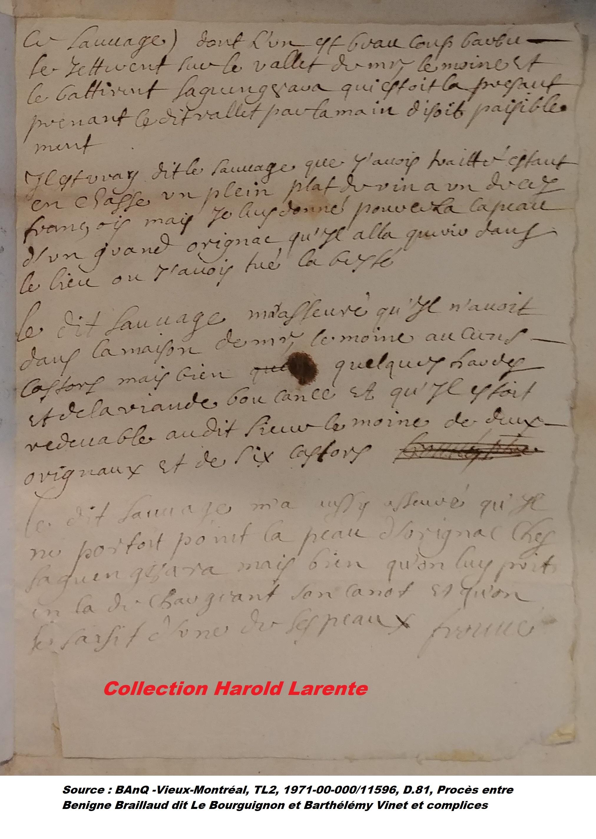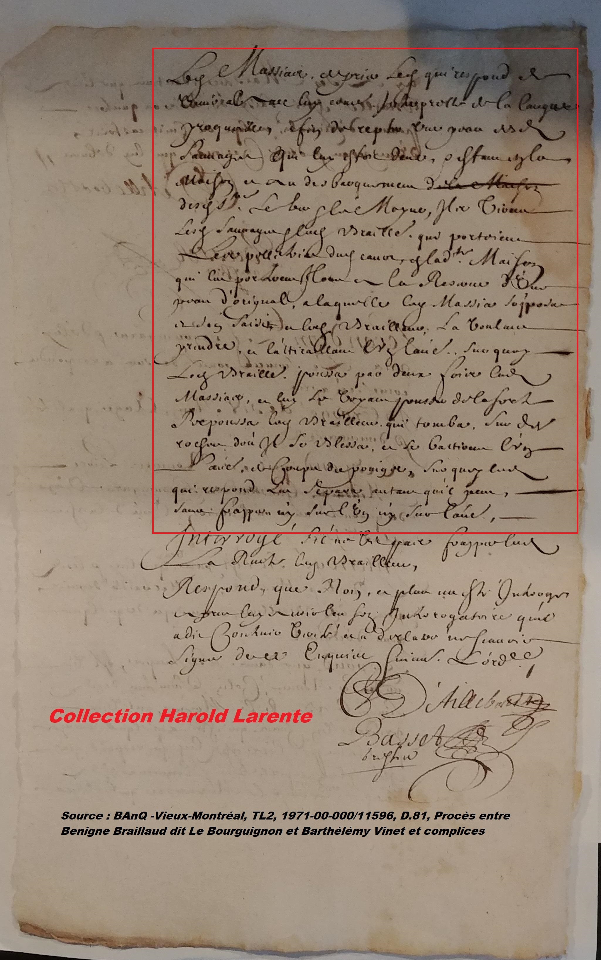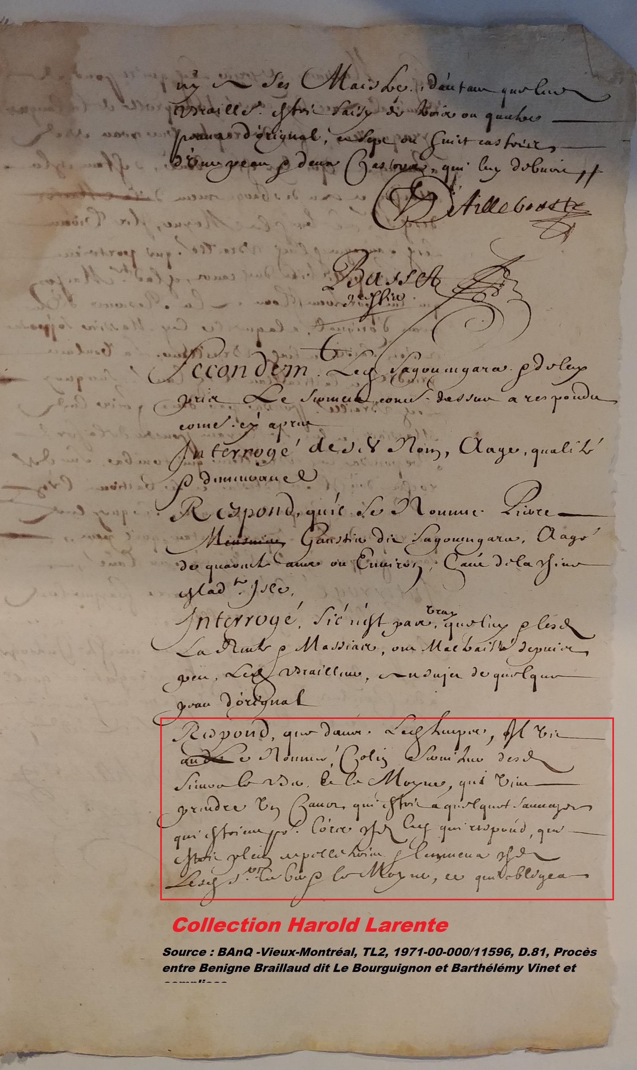« (…) que dans, ledit temps, il vit le nommé, Colin serviteur desdits sieurs Le Ber et Le Moyne, qui vint prendre un castor qui estoit a quelques sauvages qui estoient pour lors chez luy qui respond, qui estoit plein de pelleteries et l en mena chez lesdits sieurs Le Ber et Le Moyne, ce qui obligea ledit Massias et pria ledit qui respond de venir avec luy comme interprette de la langue iroquoise, afin de ___ une peau desdits sauvages qui luy estoit deue, et estant en la maison et au desbarquement de la maison desdits sieurs Le Ber et Le Moyne, ils virent lesdits sauvages et ledit Braillaud qui portoieut les pelleterie dudit canot, en laditte maison qui les portoient item a la reserve d’une peau d’orignal, a laquelle ledit Massia s’opposa en s en saisit et ledit Braillaud la voulant prendre et la tiraillant un et l autre sur quoy ledit Braillaud poussa par deux fois ledit Massias, et luy le voyant pousse de la sorte repoussa ledit Braillaud qui tomba, sur des roches d’ou il se blessa, et le battirent un et l autre de coups de poings, sur quoy ledit qui respond les separe autant qu’il peut sans frappe n’y sur l’un n’y sur l’autre (…) ».