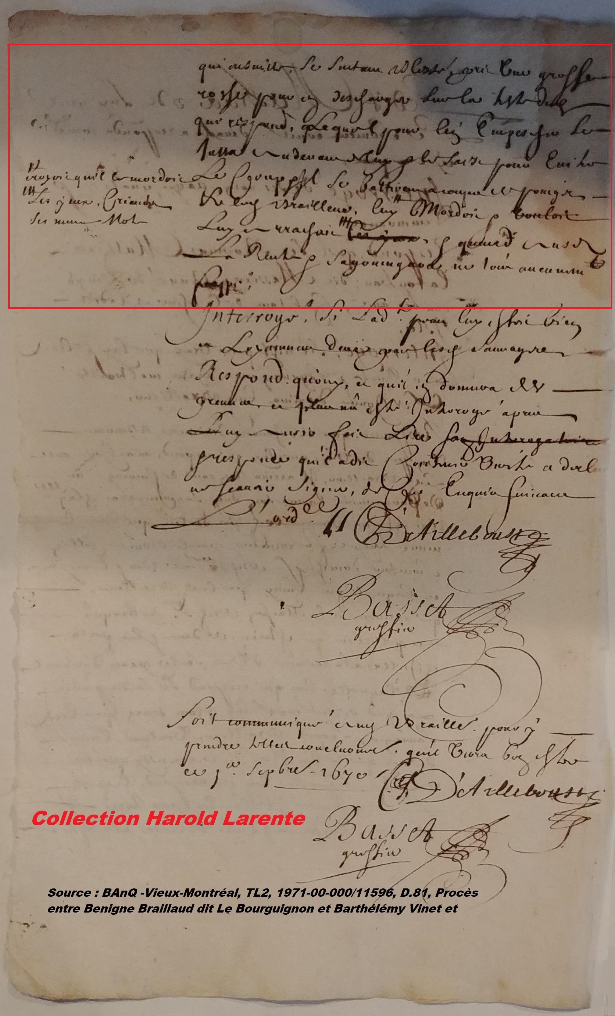[7] BAnQ -Vieux-Montréal, TL2, 1971-00-000/11596, D.81, Procès entre Benigne Braillaud dit Le Bourguignon et Barthélémy Vinet et complices.