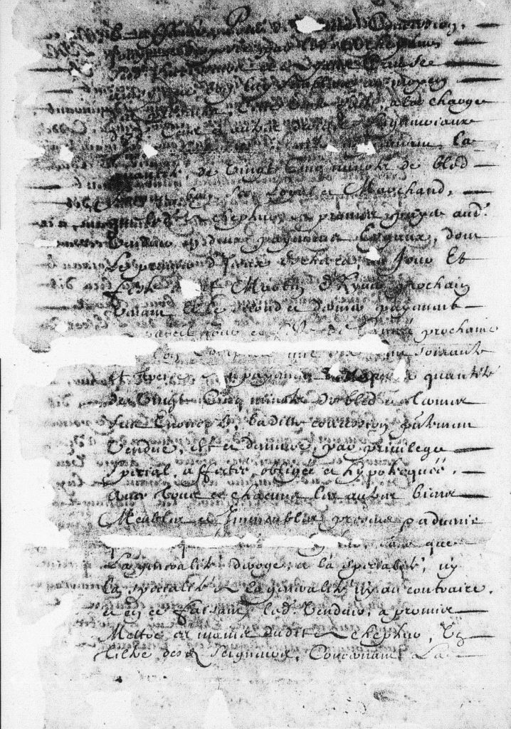[4]↑ Vente par Mathias Chaittouteau à Barthelemy Vinet dit Larente, notaire Bénigne Basset dit Deslauriers [1657-1699], numéro 795, BAnQ, Microfilm M-620-7.