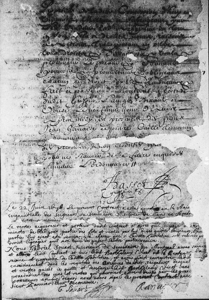 Manifestement, Massias n’a pas fourni de titre à Barthélémy Vinet dit Larente, car le 22 juin 1676, Barthélémy apporte le contrat qu’il lui été « expédié et délivré » par Basset, à la maison seigneuriale des seigneurs du séminaire Saint-Sulpice au Montréal.