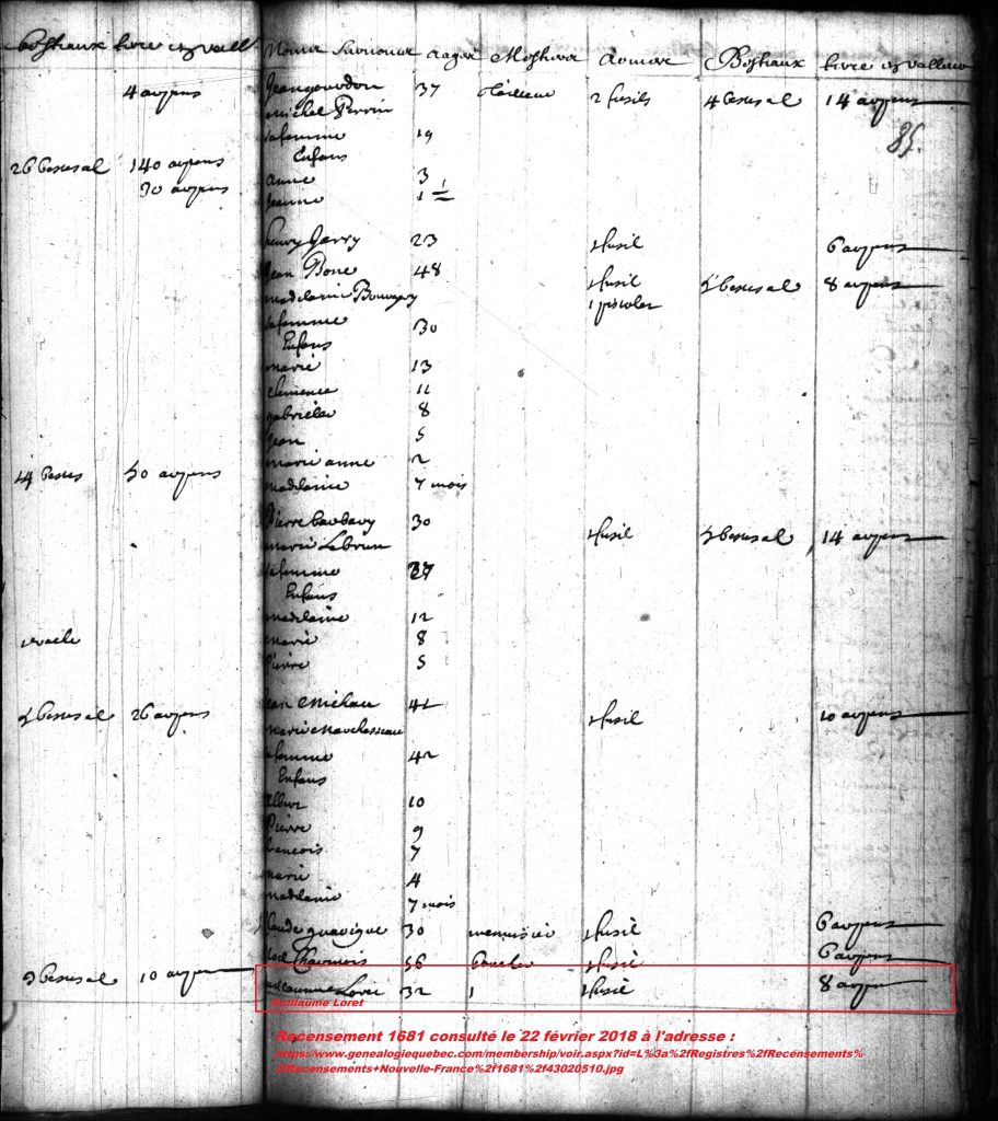 [20]↑ Benjamin Sulte dans son volume V, chapitre IV du livre HISTOIRE DES CANADIENS- FRANÇAIS , p.70, identifie l’habitation voisine de Barthélémy Vinet dit Larente, comme étant celle de Guillaume Levet. On peut consulter ce document à l’adresse suivante https://fr.wikisource.org/wiki/Page:Sulte_-_Histoires_des_Canadiens-fran%C3%A7ais,_1608-1880,_tome_V,_1882.djvu/85. Normand Moussette, à la page 27 dans son livre intitulé En ces lieux que l’on nomma La Chine, op. cité, attribue également l’ « habitation » voisine de Vinet dit Larente à un dénommé Guillaume « Levet ». Avec tout le respect que j’ai pour leur travaux, il s’agit, pour ces 2 sources, peut-être d’une mauvaise de lecture car Vinet dit Larente va céder la terre acquise de Massias à Louis Dauvernier dit Lorange et Guillaume Loret dit Lafontaine et une partie sa propriété, le 16 juin 1672, devant le notaire Basset. Ma lecture du recensement 1681 concorde avec la transaction mentionnée précédemment.