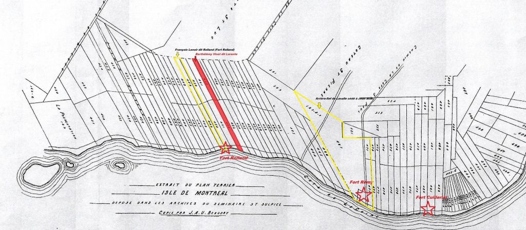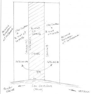 Dans un article subséquent, nous verrons que Barthélémy Vinet dit Larente cèdera à Louis D’Auvernier dit Loranger et Guillaume Loret 4 arpents de large sur 20 arpents de profondeur et qu’il conservera les 2 autres arpents de largeur sur 20 de profondeur.