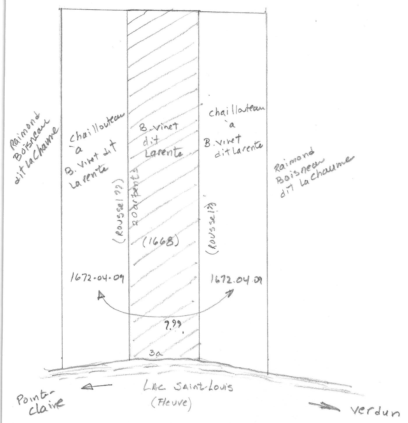 Dans un article subséquent, nous verrons que Barthélémy Vinet dit Larente cèdera à Louis D’Auvernier dit Loranger et Guillaume Loret 4 arpents de large sur 20 arpents de profondeur et qu’il conservera les 2 autres arpents de largeur sur 20 de profondeur.