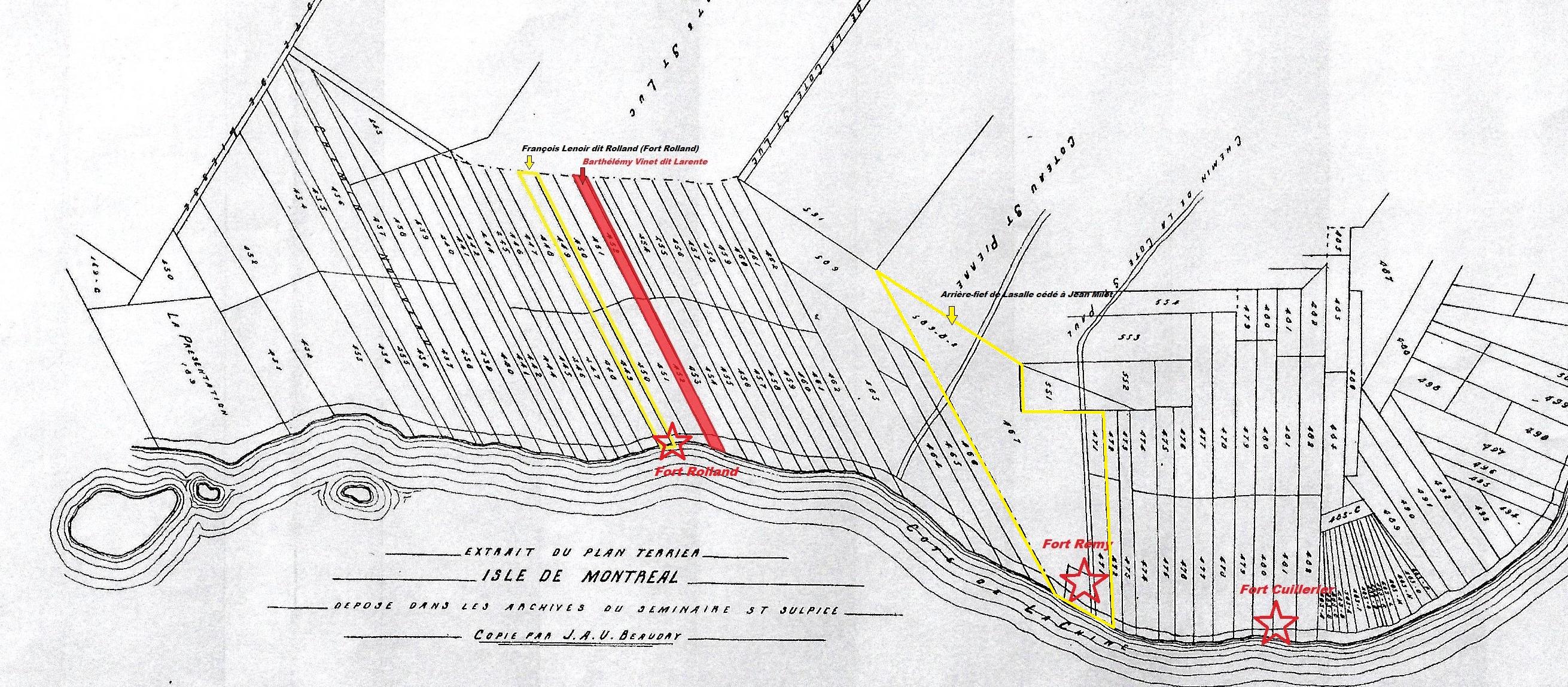 Désiré Girouard[12], indique qu’il est sur la censive numéro 452[13] du terrier de l’île de Montréal alors que Marcel Trudel[14] situe sa propriété dans l’arrière-fief de LaSalle qu’il a cédé à Jean Milot le 3 février 1669[15]. La propriété de Milot serait sur les censives 467 à 471 selon Girouard.