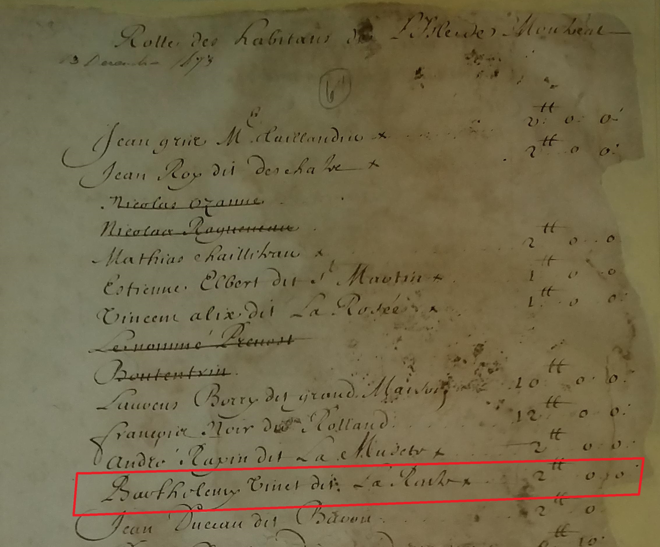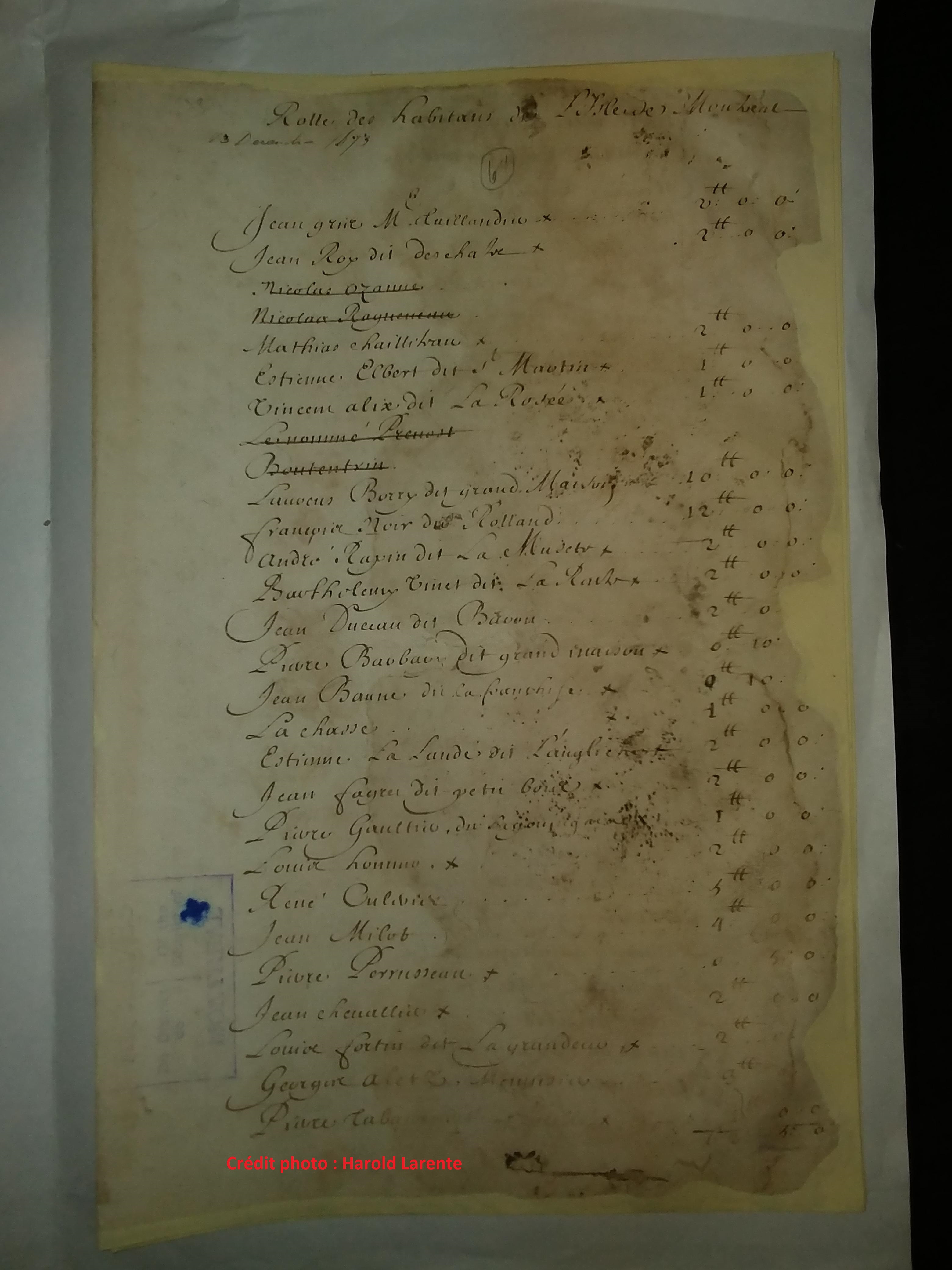 Ce rôle des cotisations des habitants, daté du 13 décembre 1673, fut dressé le par Charles D’Ailleboust et Basset, le greffier du Bailliage de Montréal.