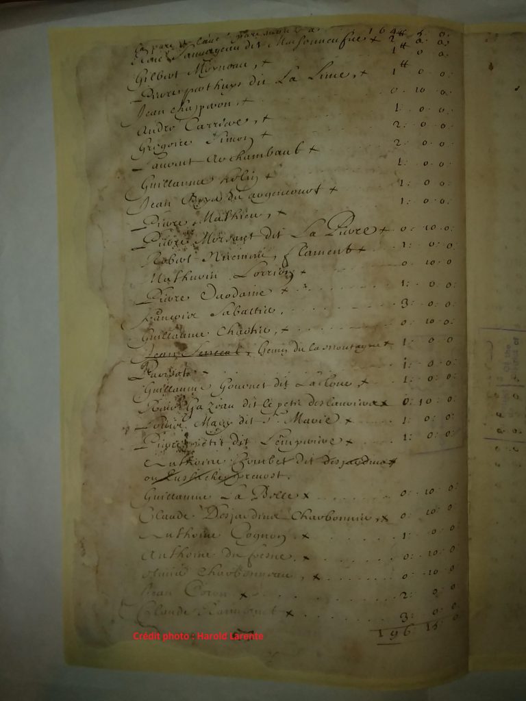 Le contenu de ce document est peu explicite. Outre, l’intitulé et la liste de près de 200 noms avec un montant qui leur sont attribués, nous retrouvons à la suite de cette liste de noms, le texte suivant: « Toutes lesquelles sommes c`y dessus contenant cent quatre vingt douse articles non compris douse de rayez se montans à la somme de trois cens vingt sept livres dix sols, laquelle sera employée comme dit est c`y dessus, et au payement de laquelle, chacun des habitans y desnommé sera contraint aux termes de notre ordonnance, dans quinzaine a conter depuis la publication des presentes et de la notification qui leur en sera faite à leur personne par ledit procureur sindic, et apportera son payement au lieu ou il leur désignera Mandons au premier huissier ou sergent sur ce requis, de mettre a exécution notre. presente ordonnance, ce fut fait et donné par nous Baillif, susdit les jour et an que dessus ».[3]