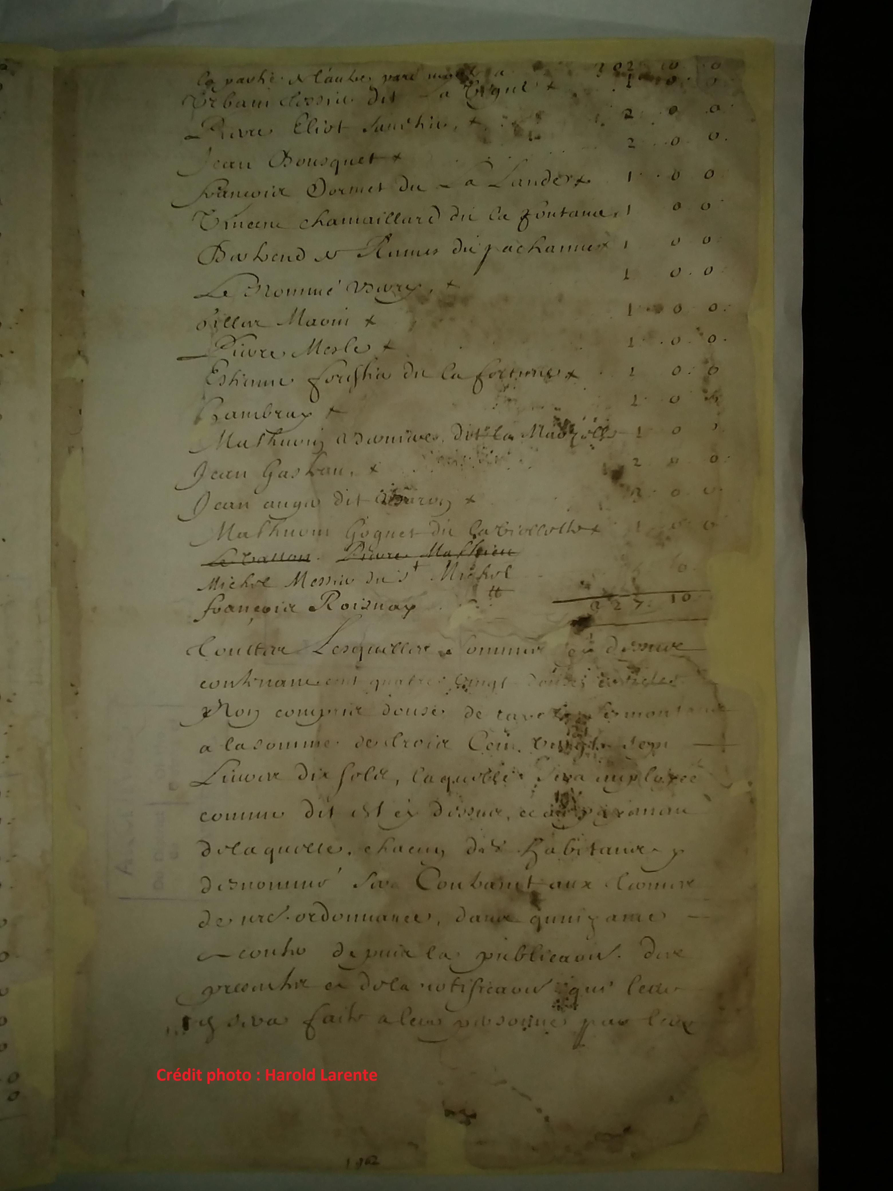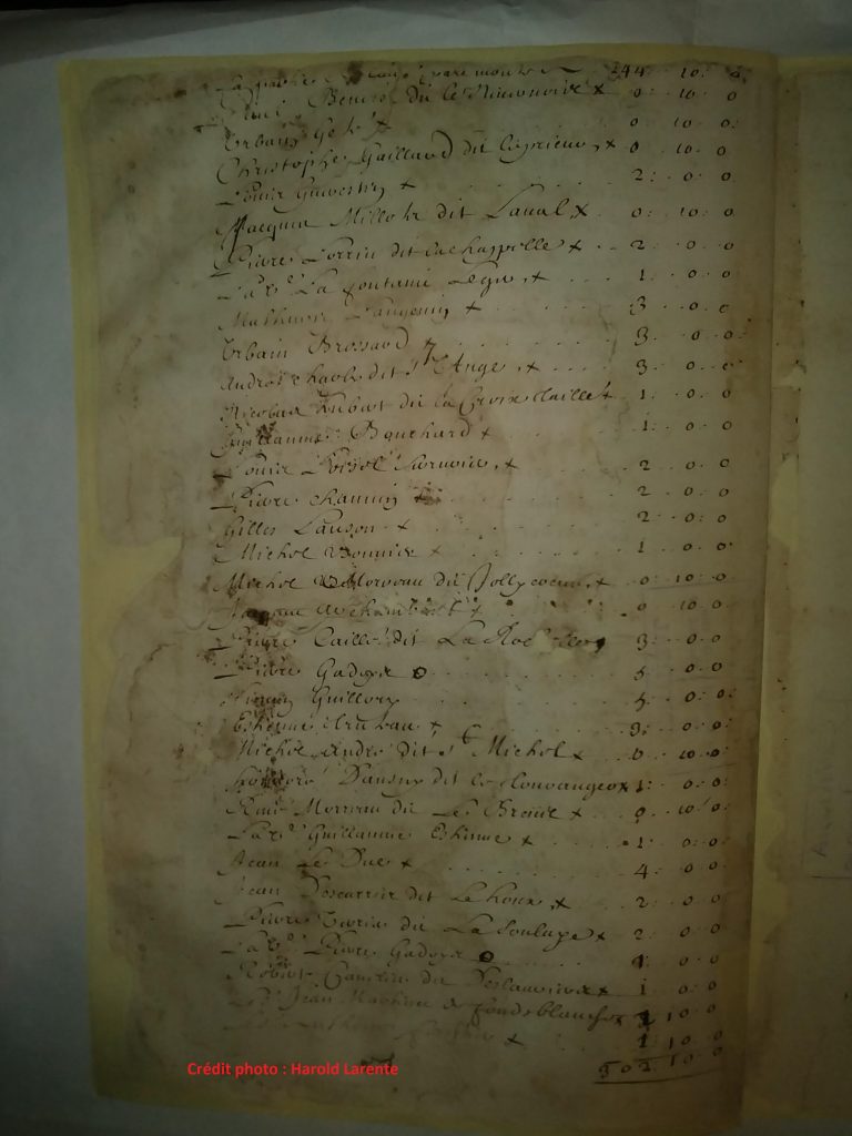 Barthélémy Vinet dit Larente devra donc acquitter une somme de 2 livres tournois dont « le payemt [paiement] desquelles Se fera en marchandise, bled, pelleteries ou argent le tout ayant cours & au prix des Marchands habitué en ce lieu ». Il est susceptible de saisie de ses biens s’il n’acquitte pas la taxe qui lui est imposée ainsi que pour couvrir les frais occasionnés par une éventuelle saisie.