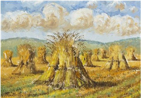 L’on retrouve dans la grange 150 minots de blé en gerbe. Sur les terres, il y a trois traines de foin et deux meulons de foin d’environ trois traines.