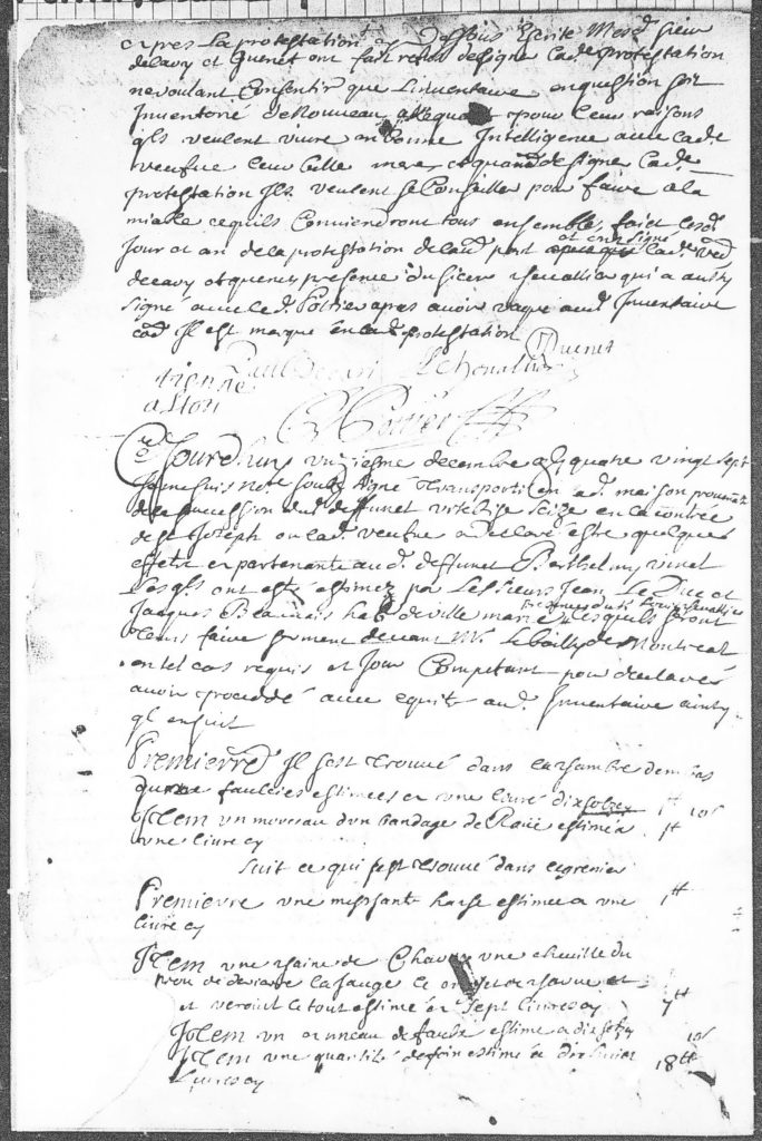 La fin de la journée du 6 décembre 1687 est marquée par une protestation de la veuve Alton au sujet des biens en nature de Marin Hurtebise, son premier mari. Elle demande en présence de Jean Quenet, son gendre et tuteur, Paul Décarie, son gendre et subrogé tuteur et Louis Chevallier que les biens d’Hurtebise soient de nouveau inventoriés, car elle estime que ceux-ci accusent une diminution importante de leur valeur depuis le décès de celui-ci.