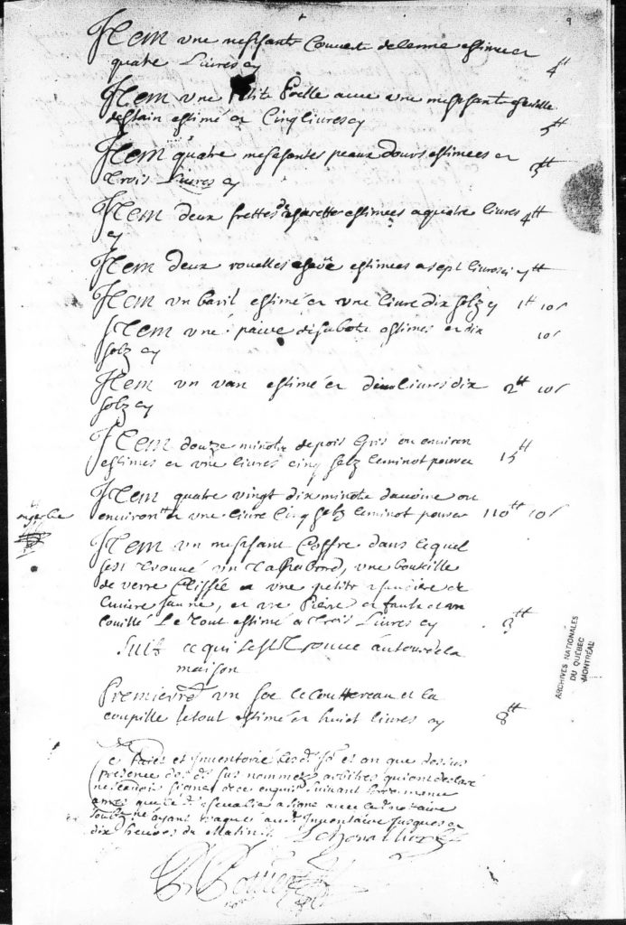 [38]↑ ANQ-M, Microfilm M-620.138, Inventaires des biens de Barthélémy Vinet dit LaRente, notaire Jean-Baptiste Pottier, 4 décembre 1687.
