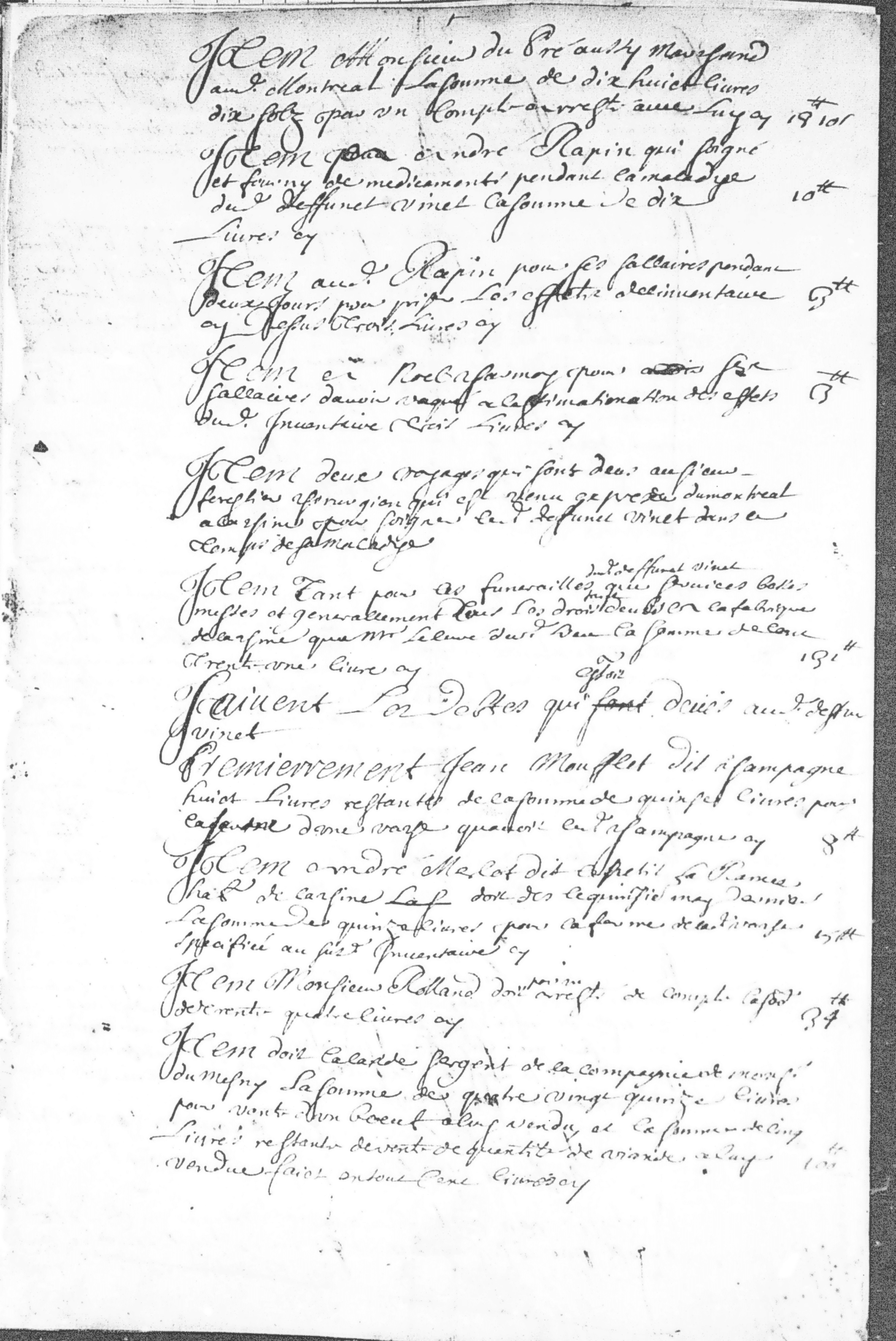 - Deux voyages de Montréal à Lachine fait par Antoine Forestier, chirurgien pour avoir soigné Vinet pendant sa maladie.