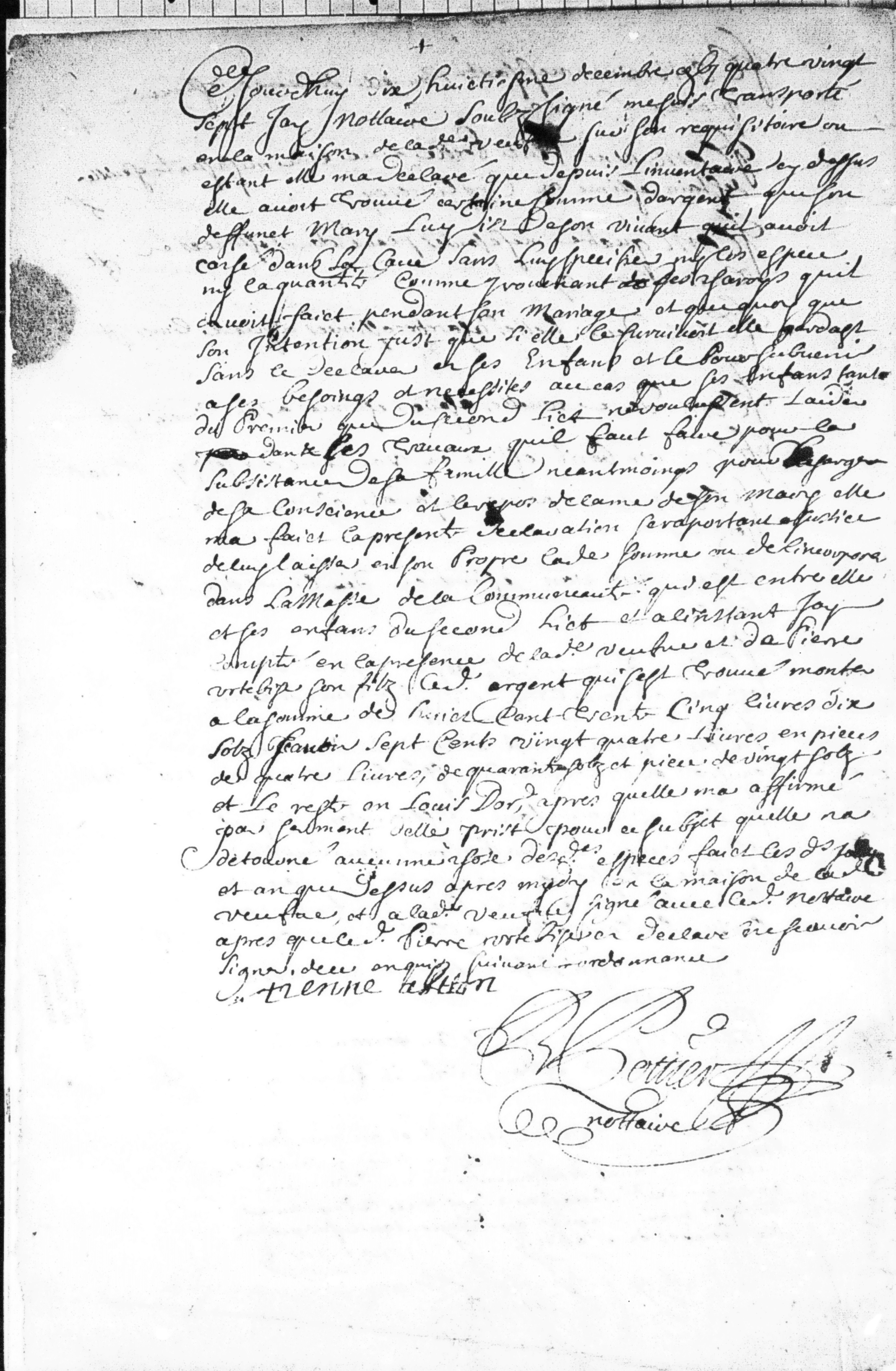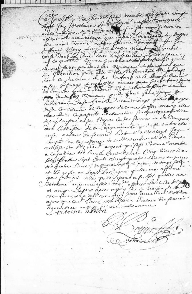 « […] pour la charge de sa conscience et le repos de l ame de son mary elle m a faict la presente declaration se raportant a justice de luy laisser en son propre laditte somme ou de l incorporer dans la masse de la communauté qui est entre elle et ses enfants du second lict […] »[38].