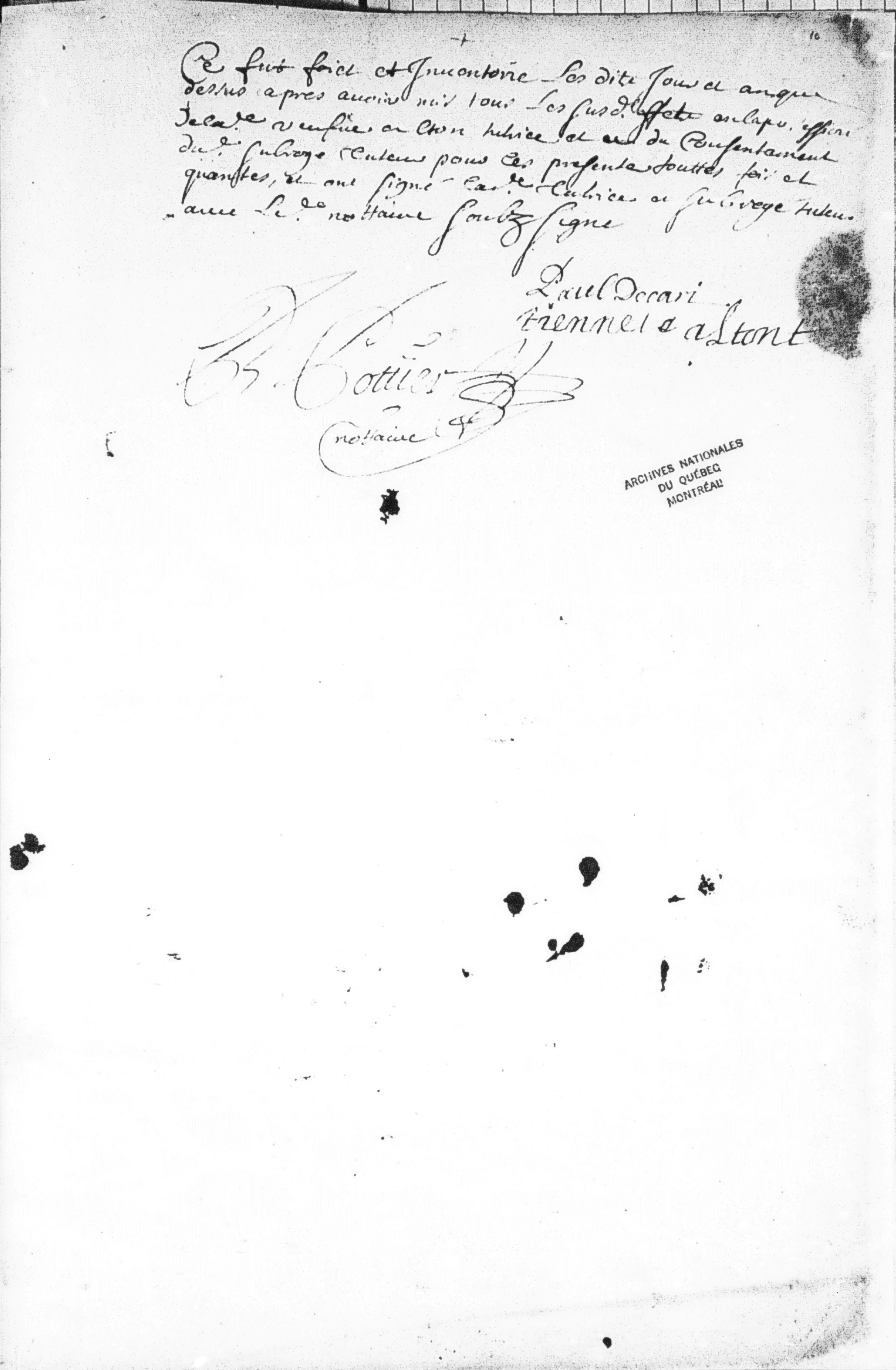 [27]↑ La déférence du notaire Pothier en soulignant « monsieur de » indique qu’il s’agit d’une personne d’un rang supérieur dans la société. Il peut s’agir de François Dauphin, sieur de LaForest, écuyer, capitaine réformé dans les troupes du détachement de la Marine, lieutenant, du fort Frontenac de 1677 à 1686. Puis gouverneur et seigneur et propriétaire du fort Saint-Louis des Illinois en 1690. Engageur de voyageur pour l’Ouest. Source : René Jetté et Université de Montréal. Programme de recherche en démographie historique, Dictionnaire généalogique des familles du Québec: des origines a 1730, Montréal, Presses de l’Université de Montréal, 1983, p. 310.