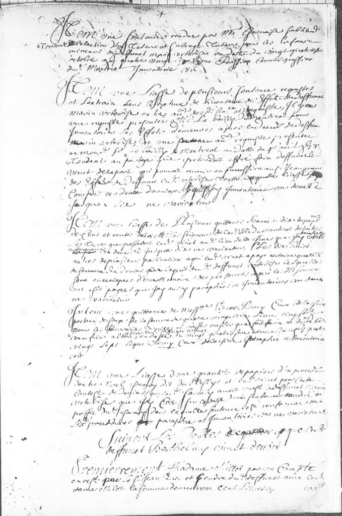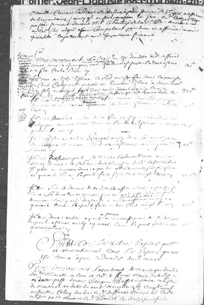 - Une liasse de plusieurs sentences et requêtes et un extrait sans signature de l’inventaire des biens de Marin Hurtubise, dont une requête pour inventorier les biens de Marin Hurtubise, une autre daté 4 avril [?][14] quant au partage que Vinet prétendait être fait en succession à Jean Quenet de la succession de Marin Hurtubise;