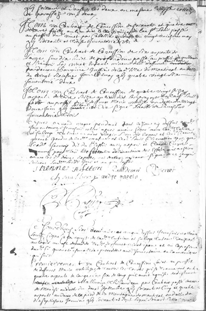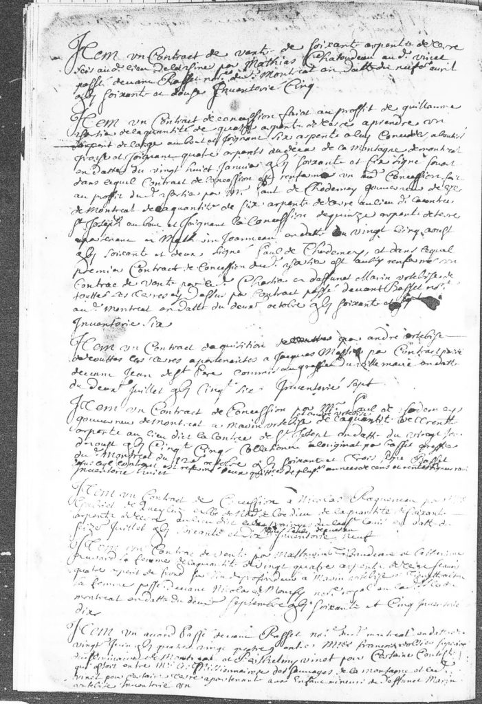 - Un contrat de concession de Guillaume Chartier en date du 28 janvier 1666 signé par Gabriel Souart dans le lequel se trouve un autre contrat de concession au profit de Chartier par Paul Chomedey, gouverneur de l’île de Montréal et dans lequel est aussi renfermé le contrat de vente dudit Chartier de toutes les terres décrites aux contrats ci-dessus à Marin Hurtebise passé chez le notaire Basset à Montréal le 2 octobre 1667;