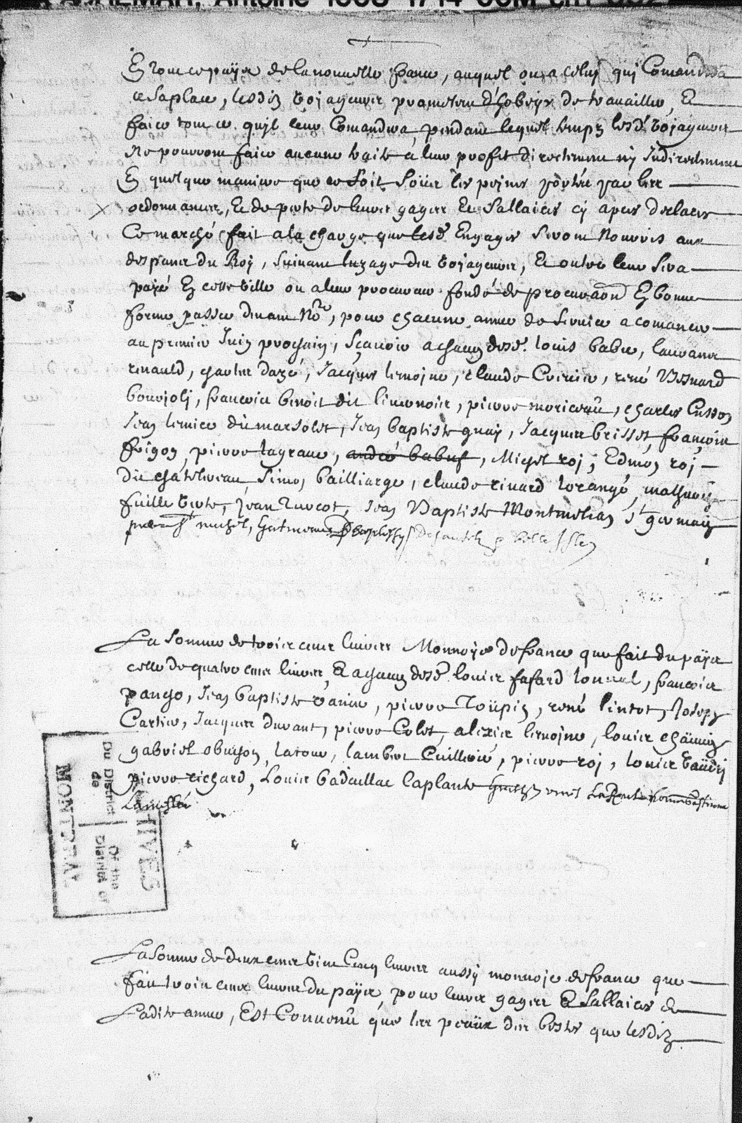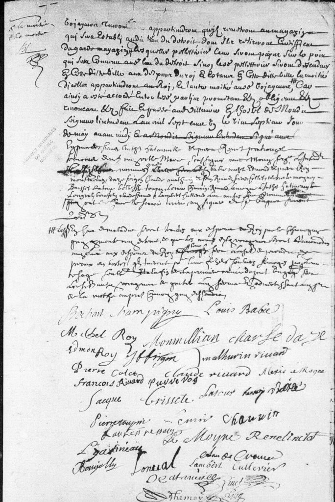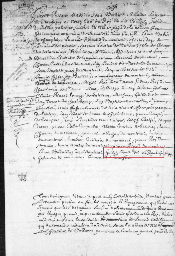 [13] 27 mai 1701, Engagement en qualité de voyageur de Louis Babie, voyageur, de Champlain, Laurent Renauld, voyageur, de Montreal, Charles Dazé, voyageur, de la Riviere des Prairies, Jacques Lemoine, voyageur, de Batiscan, Claude Crevier, voyageur, des Trois Rivières, René Besnard dit Bourjoly, voyageur, des Trois Rivières, François Benoit dit Livemois, voyageur, de Longüeil, Pierre Moriceaû, voyageur, de Montreal, Charles Cusson, voyageur, de Montreal, Jean Lemire dit Marsolet, voyageur, de Montreal, Jean-Baptiste Guay, voyageur, de Montreal, Jacques Brisset, voyageur, de l’île Dupas, François Frigon, voyageur, de Batiscan, Pierre Lagrave, voyageur, de Montreal, Pierre St Michel, voyageur, Michel Roy, voyageur, de Ste Anne, Edmond Roy dit Chatelreaû, voyageur, de Ste Anne, Simon Balliarge, voyageur, du Cap de la Magdeleine, Claude Rivard dit Lorangé, voyageur, de Batiscan, Mathurin Fuilleverte, voyageur, Jean Turcot, voyageur, de Charlebourg, Jean-Baptiste Montmillian dit St Germain, voyageur, de Quebec, Pierre Desautels dit Lapointe, voyageur, Henri Belleislle, chirurgien et voyageur, Louis Fafart dit Lonval, voyageur, des Trois Rivières, François Pancho, voyageur, de Batiscan, Jean-Baptiste Vanier, voyageur, de Charlebourg, Pierre Toupin, voyageur, de Beauport, René Lintot, voyageur, des Trois Rivières, Joseph Cartyé, voyageur, Jacques Duran, voyageur, Pierre Colet, voyageur, de Quebec, Alexis Lemoine, voyageur, de Batiscan, Louis Chaüvin, voyageur, de Montreal, Gabriel Obuchon, voyageur, de Montreal, Latour, voyageur, de Montreal, Lambert Cuillerier, voyageur, de Montreal, Pierre Roy, voyageur, de Ste Anne, Louis Vaudry, voyageur, de Montreal, Pierre Richard, voyageur, de Montreal, Louis Badaillac, voyageur, de Montreal, Guillaume Vinet dit Larente, voyageur, Jean-Baptiste Gatineau, voyageur et Louis Gatineau dit Lameslée, voyageur, au Roi., notaire Antoine Adhémar dit St-Martin [1668-1714], ANQ-M (maintenant BAnQ), M-620.1410. L’acte et ma transcription se trouve à la fin de l’article.