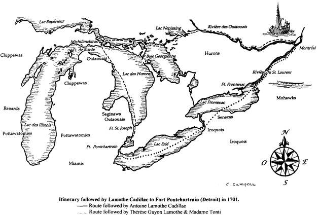 Cadillac avait souhaité emprunter la route passant par le lac Érié, mais le gouverneur Callières en décida autrement. La route de l’Outaouais fut choisie, car les Iroquois, qui vivaient dans la partie ouest et nord de l’actuel État de New York, étaient hostiles aux Français et n’auraient permis à personne d’utiliser la route de Niagara.