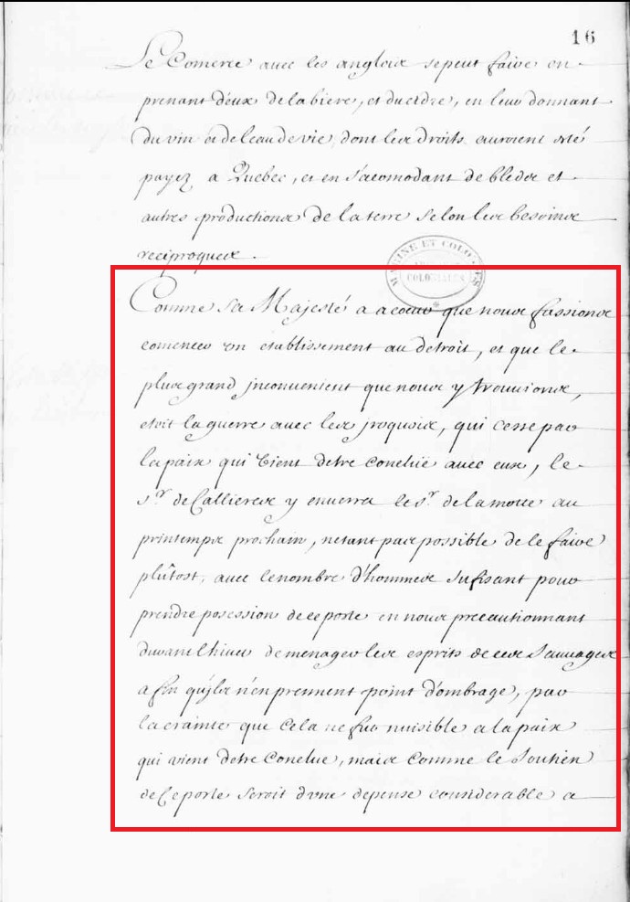 « Comme sa Majesté a a coeur que nous fassions comencer un etablissement au Detroit, et que le plus grand inconvenient que nous y trouvions, etoit la guerre avec les iroquois, qui cesse pas la paix qui vient d etre concluë avec eux[9], le sieur de Callieres y enverra le sieur Lamotte au printemps prochain, n etant pas possible de le faire plûtost, avec le nombre d’hommes sufisant pour prendre posession de ce poste en nous precautionnant durant l hiver de menager les esprits de ces sauvages afin qu’ils n’en prennent point d’ombrage, par la crainte que cela ne fit nuisible a la paix qui vient d etre conclue, (…) »[10]