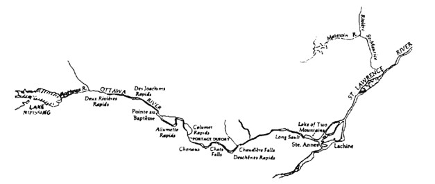 À l’embouchure de l’Outaouais, les voyageurs affrontèrent une section difficile de sept à huit milles[19] de rapides entre Hull et Aylmer, au Québec, passant au nord des chutes de la Chaudière, la Petite Chaudière, les rapides Deschênes, et ce qui est aujourd’hui Ottawa et les chutes de la rivière Rideau. Après les rapides des Chats, ils retrouvaient un courant plus paisible.