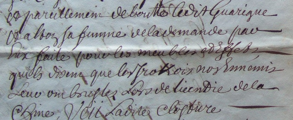 « … pareillement deboutté ledit Garigue et Alton sa femme de la demande par eux faite pour les meubles et effets qu’ils disent que les Iroquois nos ennemis leur ont bruslez lors de l’incendie de Lachine [souligné par nous] ».[16]