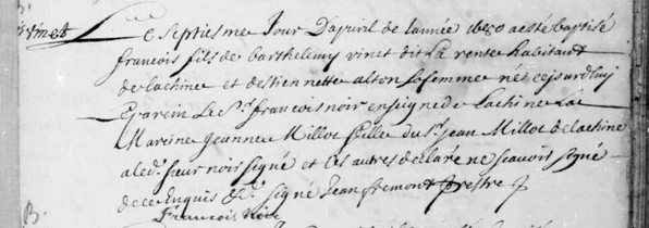 [4] Jean Milot est présent lors de l’élection d’un tuteur pour François et ses frères et sœurs. Voir : Tutelle des enfants mineurs des défunts Étiennette Alton, Marin Hurtubise (son premier époux) et Barthélémy Vinet dit Larente (son second époux), 21–22 novembre 1687, BAnQ Vieux-Montréal (anciennement ANQ-M), cote CC601, S1, SS1, D22.