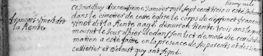 [33] Acte de sépulture de François Vinet dit Larente, 19 janvier 1703, paroisse Saints-Anges de Lachine, registre paroissial catholique, collection Drouin (LAFRANCE), GenealogieQuebec.com, [en ligne], https://www.genealogiequebec.com/Membership/LAFRANCE/img/acte/14630