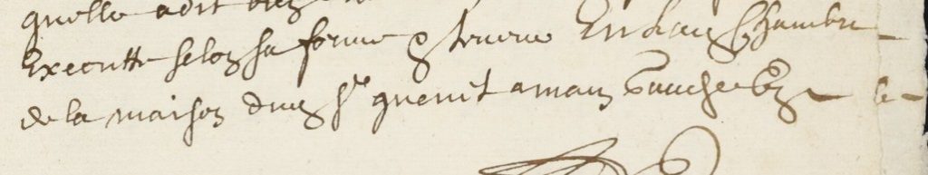 Comme souligné précédemment, Marguerite André est finalement libérée grâce à Jean Quenet, marchand bourgeois influent de Montréal. Selon son testament détaillé, rédigé le 14 juillet 1699 devant le notaire Antoine Adhémar dit St-Martin[21], Marguerite vit alors chez Quenet, dans une chambre située à gauche en entrant dans la maison. Cette chambre offre une vue directe sur la rivière Saint-Pierre — une petite rivière aujourd’hui disparue, qui traversait Montréal pour se jeter dans le fleuve Saint-Laurent près de l’actuelle Pointe-à-Callière — ainsi que sur le mont Royal, visible au loin.